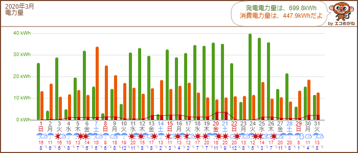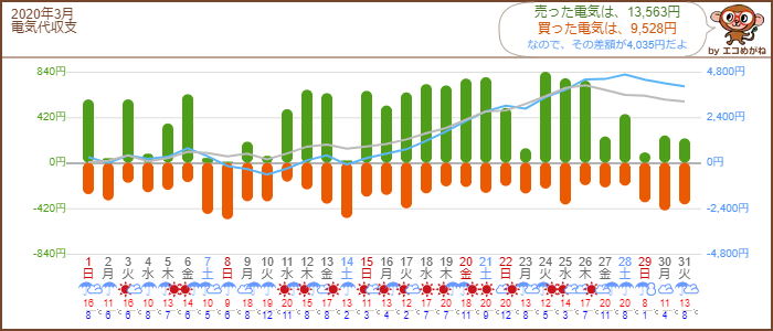 2020年03月はギリギリ黒字だった2020年02月より大幅に黒字が増えた。気になる発電量と金額、更に驚きの発電効率を大公開!!