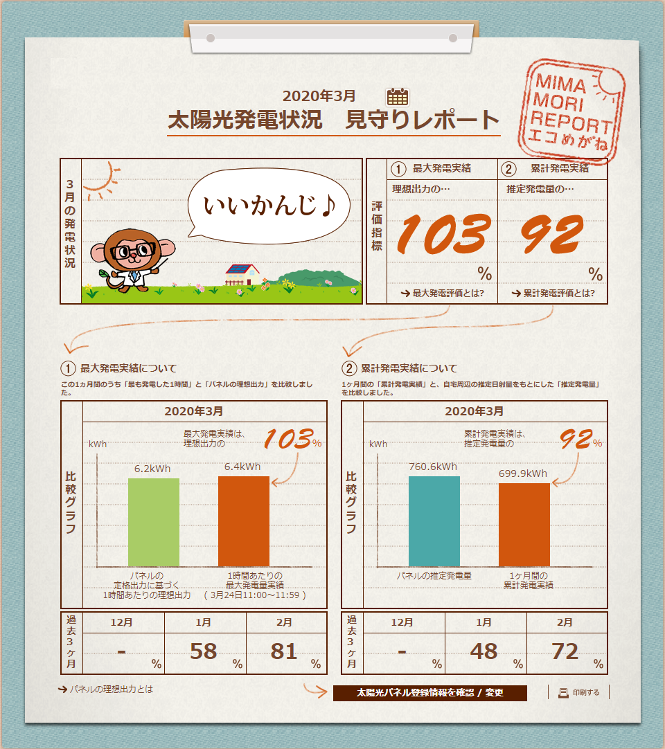私の事務所では発電量などの実績をクラウドで管理して表示するサービスである「エコめがね」を使用しているが、このサービスには「見守りレポート」と呼ばれる発電効率を評価し、パネルの状態を把握するための機能がある。
