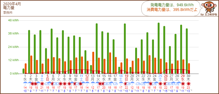 結果的に合計発電量は3月の約700kWhから大幅に増え、約950kWhに達した。