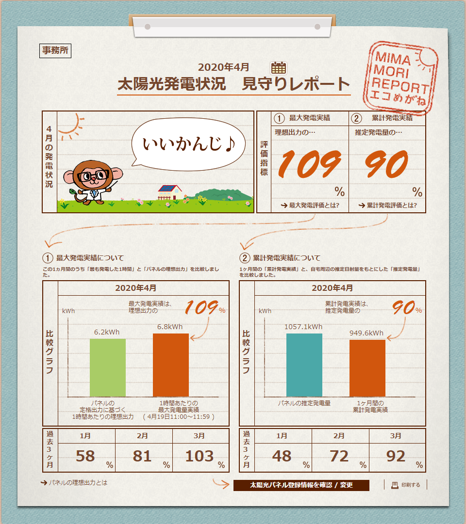 私の事務所では発電量などの実績をクラウドで管理して表示するサービスである「エコめがね」を使用しているが、このサービスには「見守りレポート」と呼ばれる発電効率を評価し、パネルの状態を把握するための機能がある。