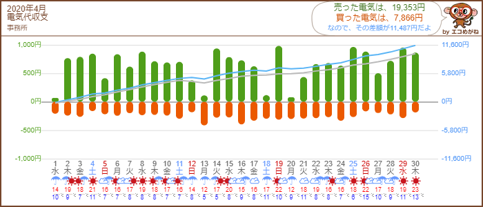 ■(緑)が売電額、■(橙)が買電額、━(水色)が収支を表している。