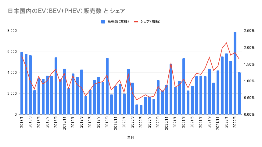 日本国内のEV(BEV+PHEV)販売数とシェアの推移(クリックで拡大)