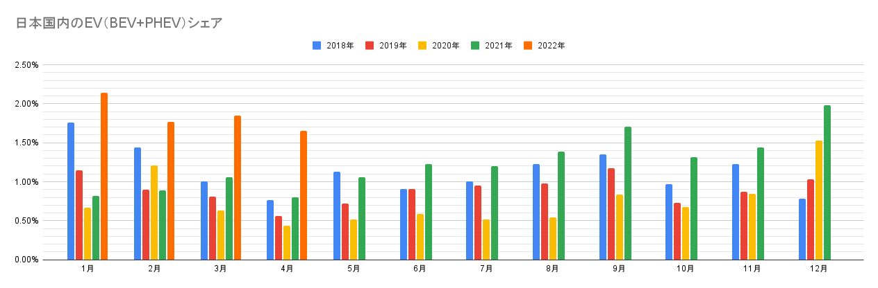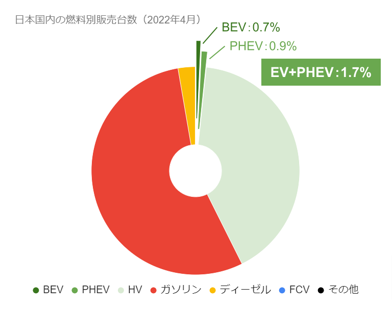 【日本国内のEV販売】2022年4月のEVシェアは1.7%、前年比で2倍に!