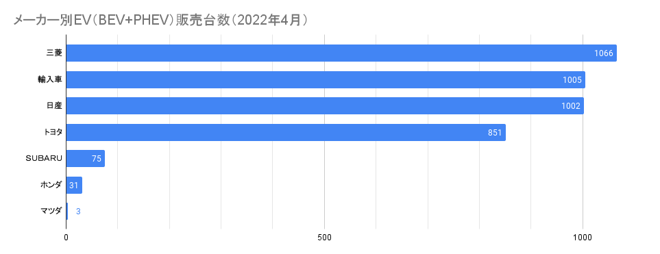 2022年4月のトップメーカーは三菱で、1,066台(すべてPHEV)と前年の539台から約2倍に増加。まだ4月の車種別台数は公開されていないものの、3月に続きアウトランダーとエクリプスクロスがそれぞれ約半分を占めていると思われる。