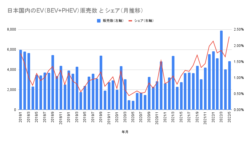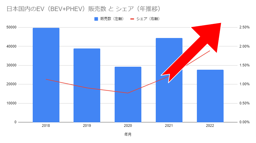 日本国内のEV(BEV+PHEV)販売数とシェアの推移(クリックで拡大)