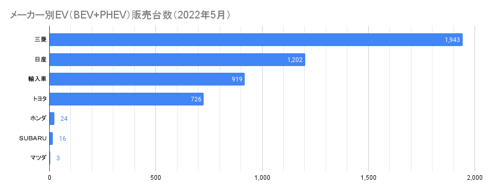 2022年5月のトップメーカーは4月に続いてPHEVが好調な三菱で、1,943台(すべてPHEV)と前述の通り6倍以上に増加。まだ5月の車種別台数は公開されていないものの、4月は約8割がアウトランダーPHEVだったことから、5月も引き続きアウトランダーPHEVが大半を占めていると思われる。