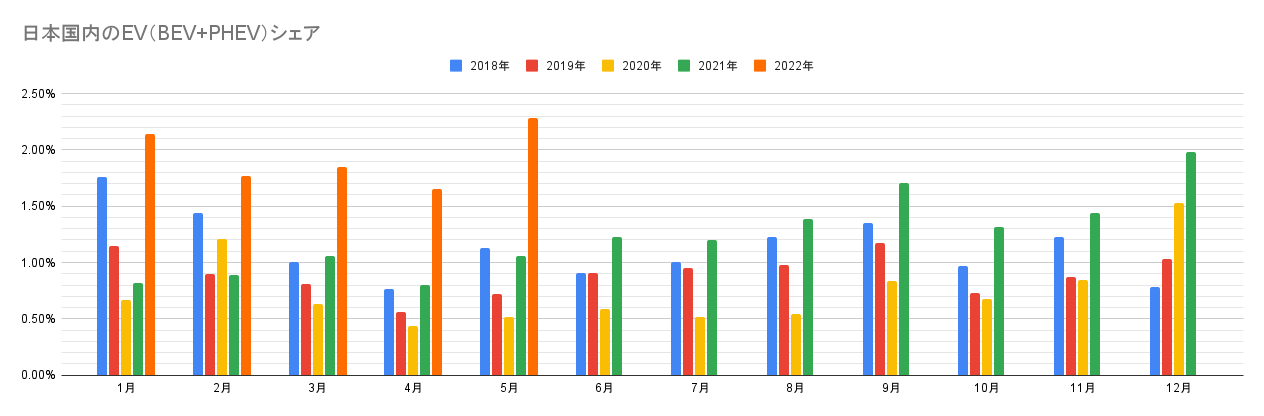 【日本国内のEV販売】2022年5月のEVシェアは2%を突破、日産サクラが初登場!