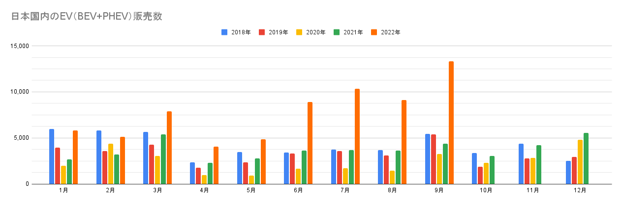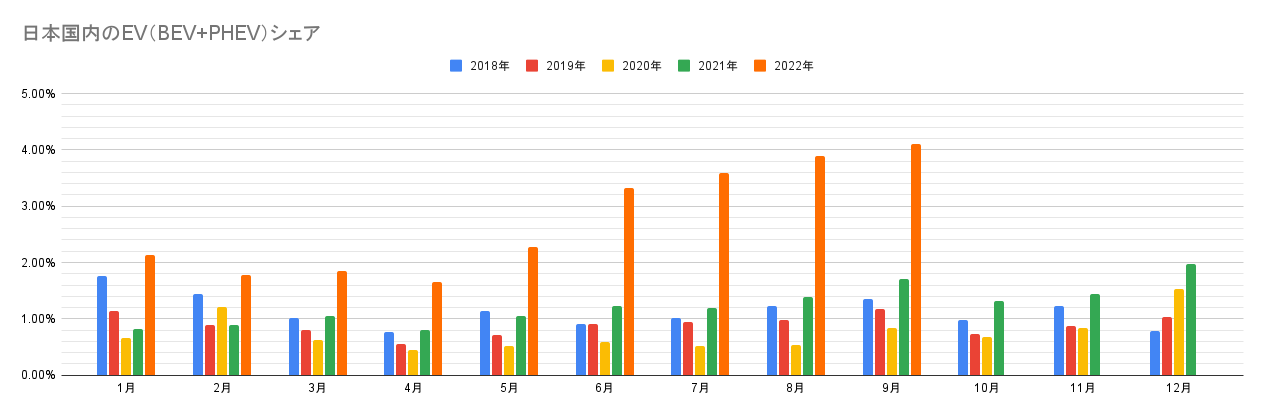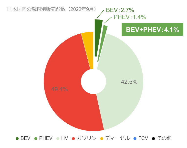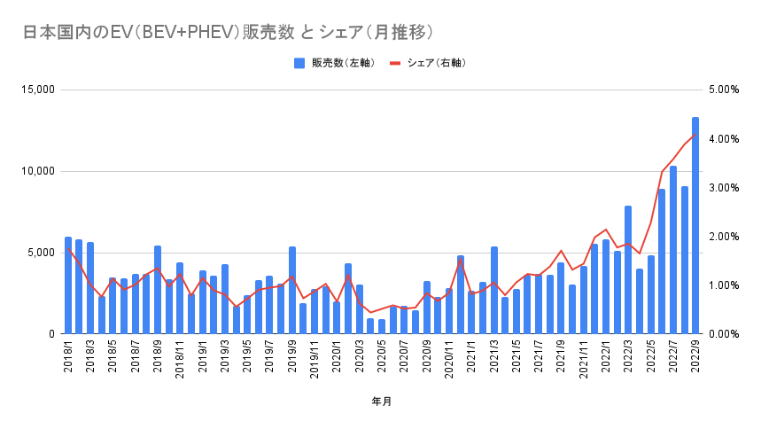 【日本国内のEV販売】2022年9月のEVシェアは約4.1%、販売台数も1.3万台で過去最高に!