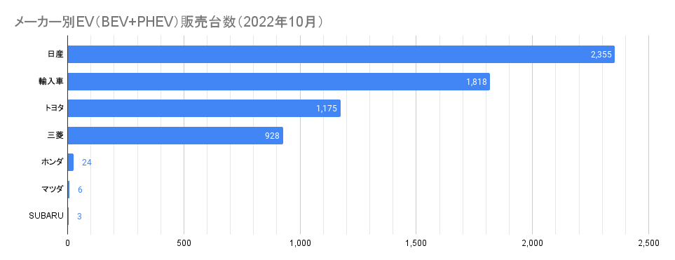 2022年10月のトップメーカーは9月に続いて日産サクラが好調な日産で、2,355台のうち1,880台が軽自動車の日産サクラと公開されており、残りの475台が日産リーフと日産アリアと推測される。