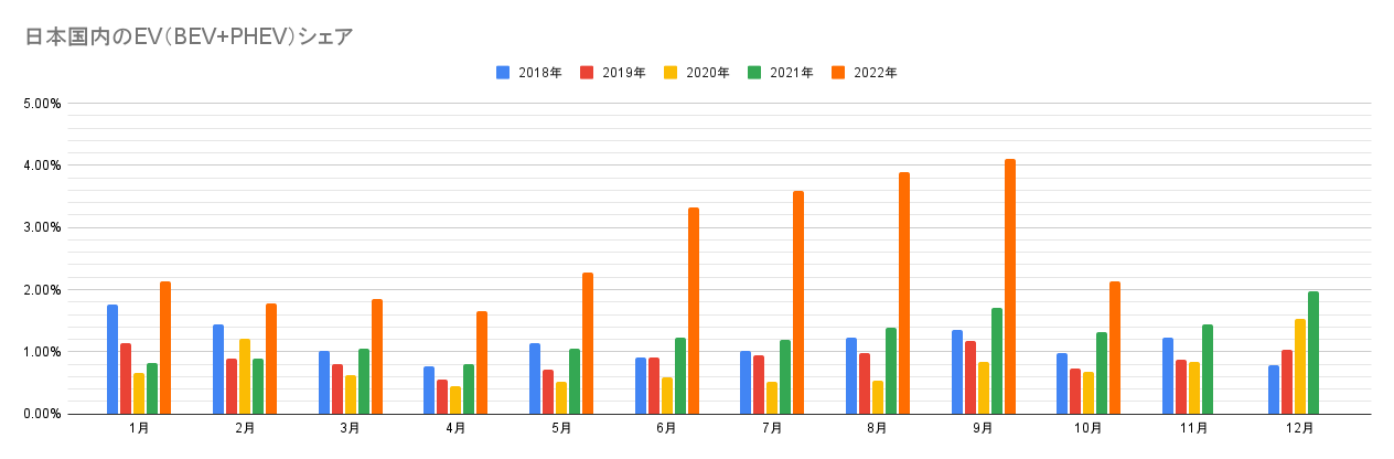 【日本国内のEV販売】2022年10月のEVシェアは約2.1%、台数ベースでは2倍以上の成長!