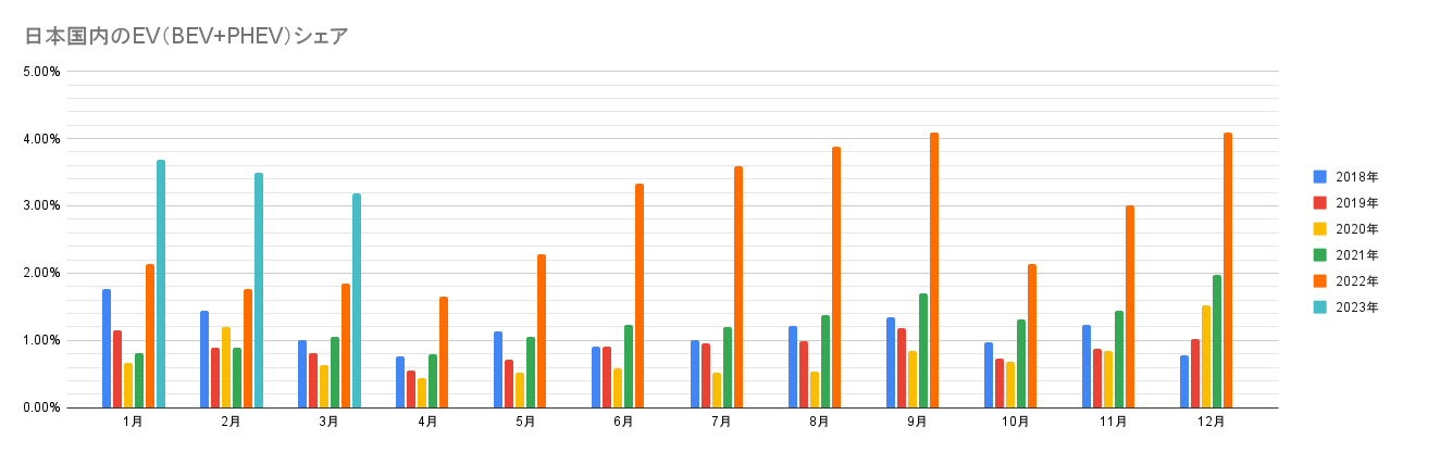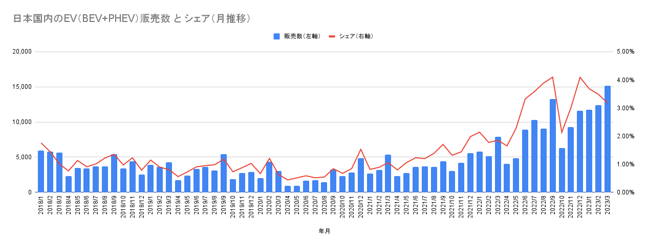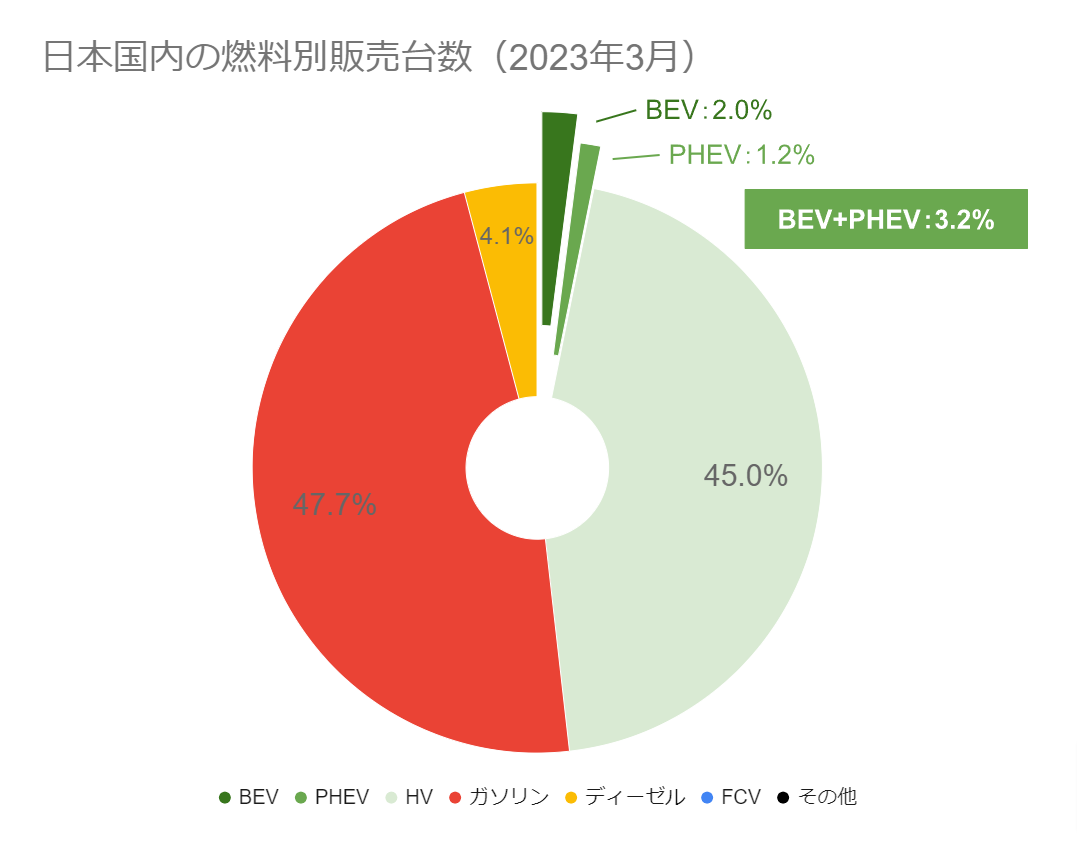 【日本国内のEV販売】2023年3月のEVシェアは3.2%、15,000台以上を販売し過去最高を更新!