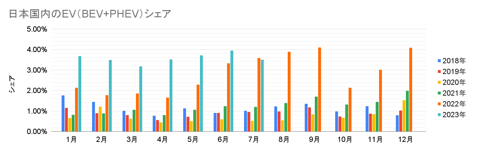 7月の月推移を見ると台数・シェアともに6月から減少。より重要な長期トレンドでは2020年から成長が続いているが、2023年は1年程度の停滞が予想される。