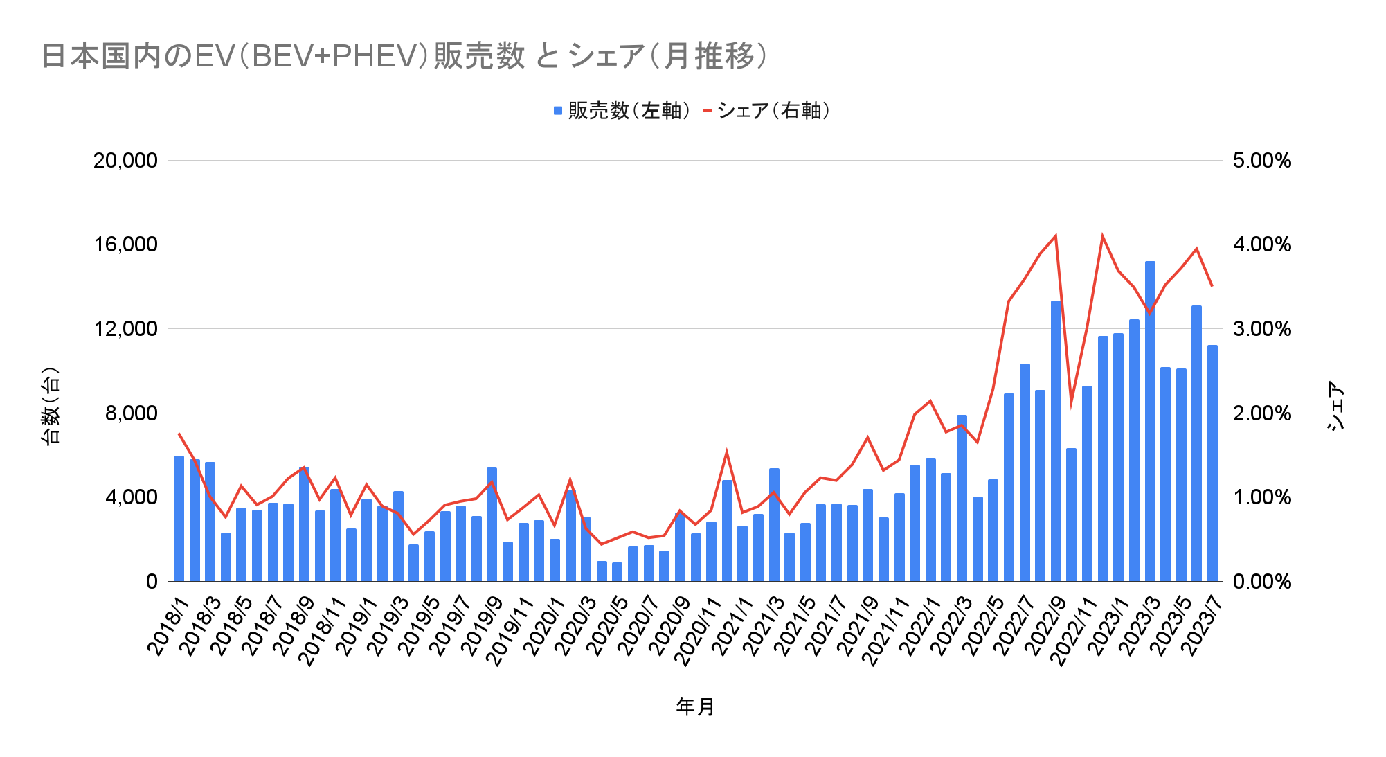 2023年7月の販売台数は11,229台で、最も重要な指標である前年比では10,323台から8.78%の増加となった。国内のEV販売数は2022年6月~7月頃に日産サクラと三菱ekクロスEVの納車が本格化したことで急成長。一方でそれ以降は有力な新車種が発売されておらず、前年比での成長が鈍化した。
