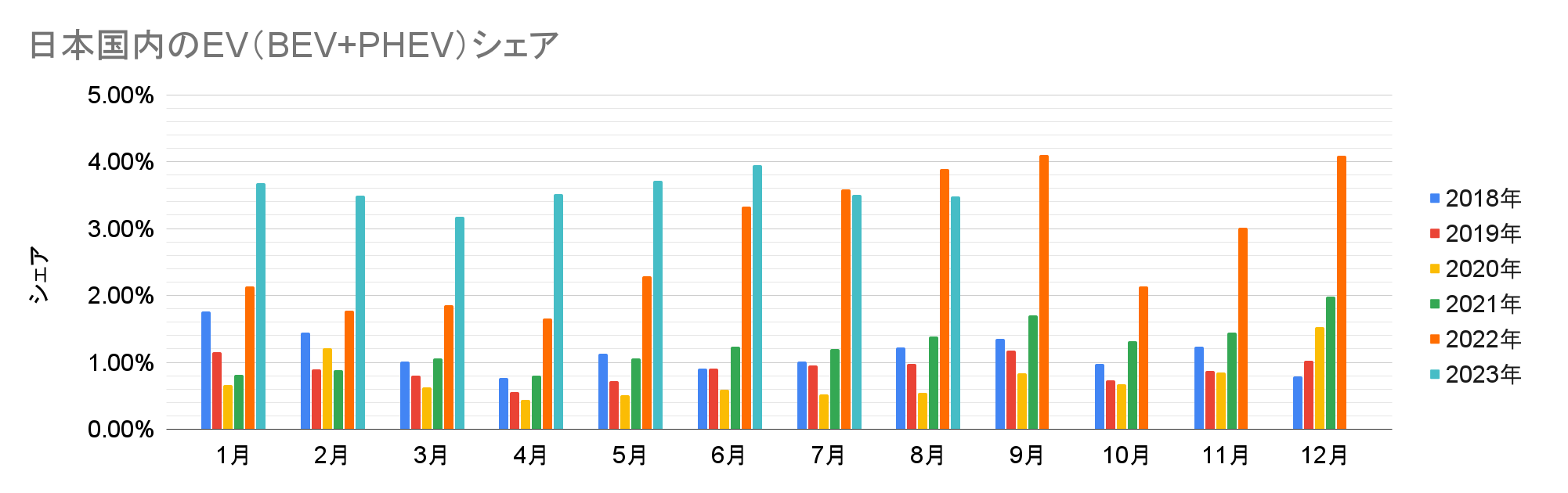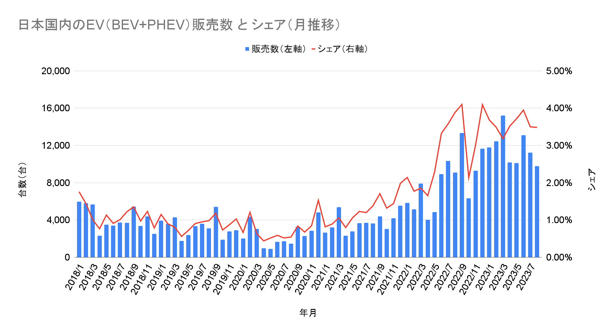 日本国内のEV(BEV+PHEV)販売数とシェアの推移(クリックで拡大)