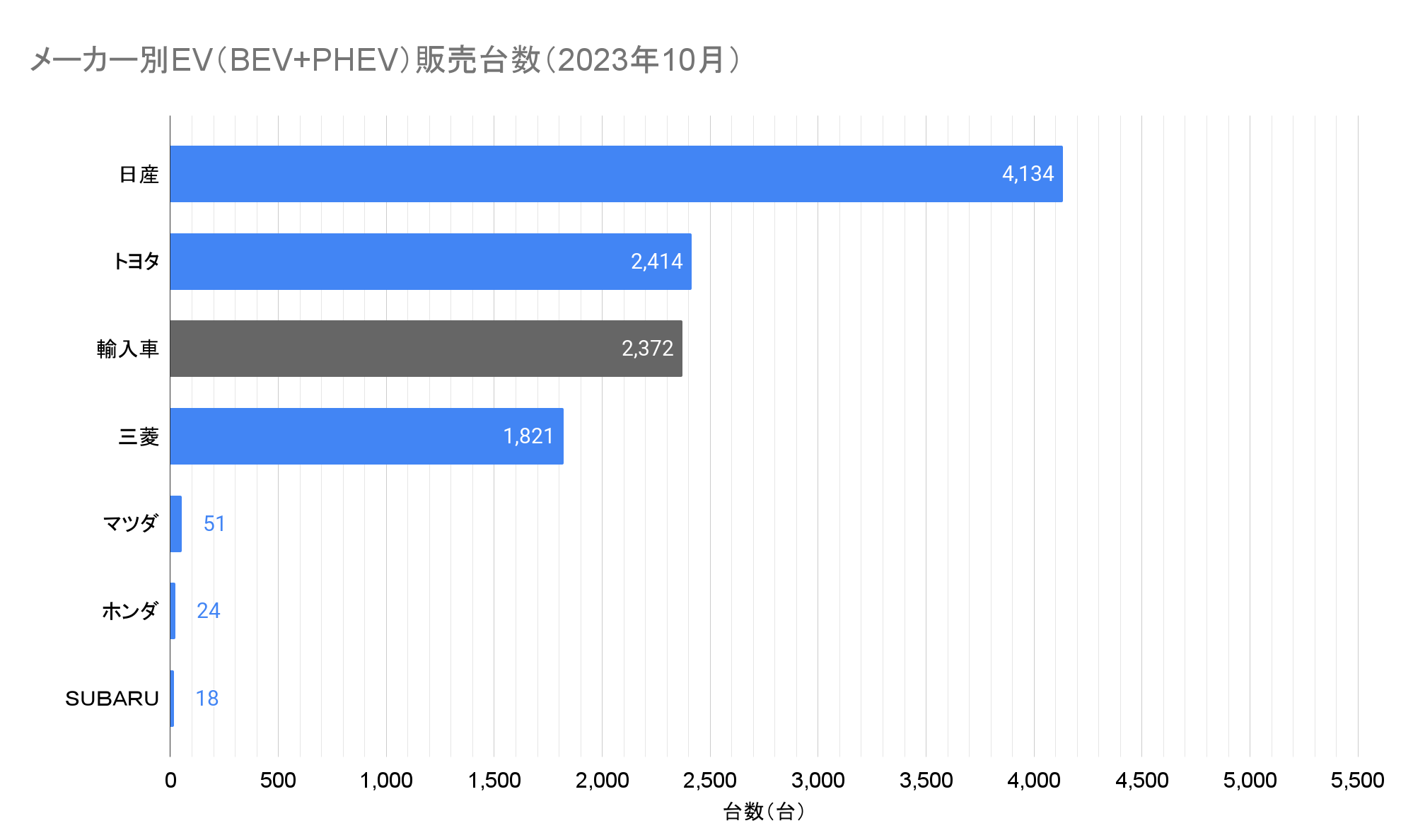 2023年10月のトップメーカーは引き続き4,134台を販売した日産で、前年の2,355台から大きく増加し、国内のEV販売を牽引している。前月に続き日産サクラが2,990台で最多の車種となり、前年の1,880台から大きく増加。さらに日産リーフが886台で登録車の車種別ランキングで45位と公開されており、残りの258台が日産アリアと推測される。