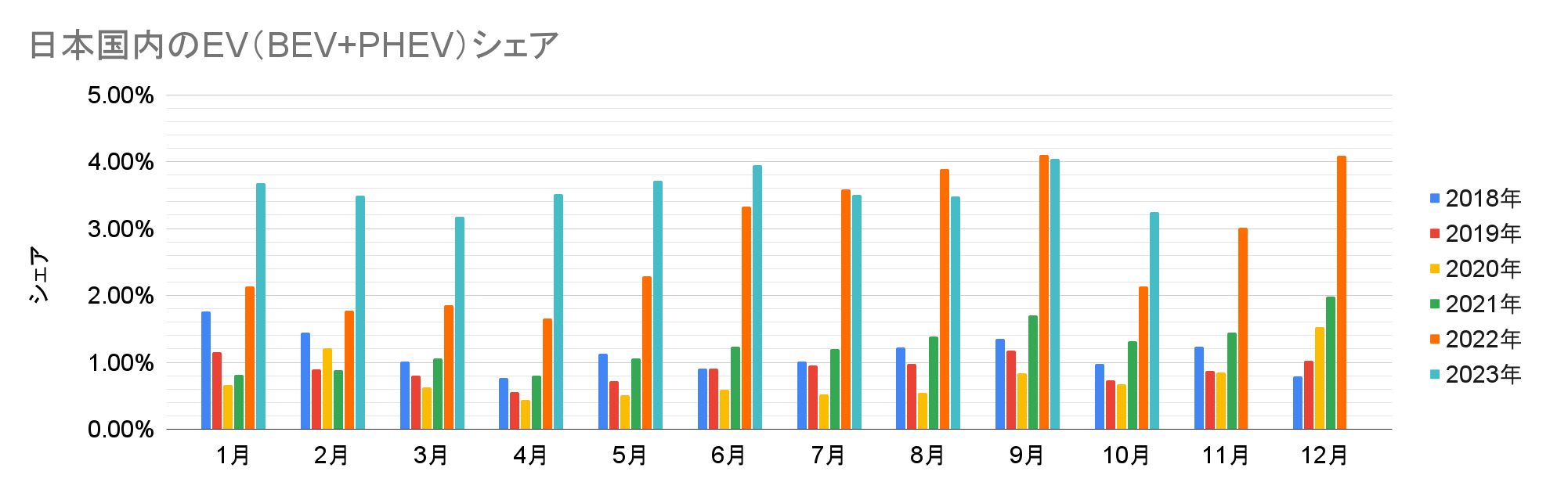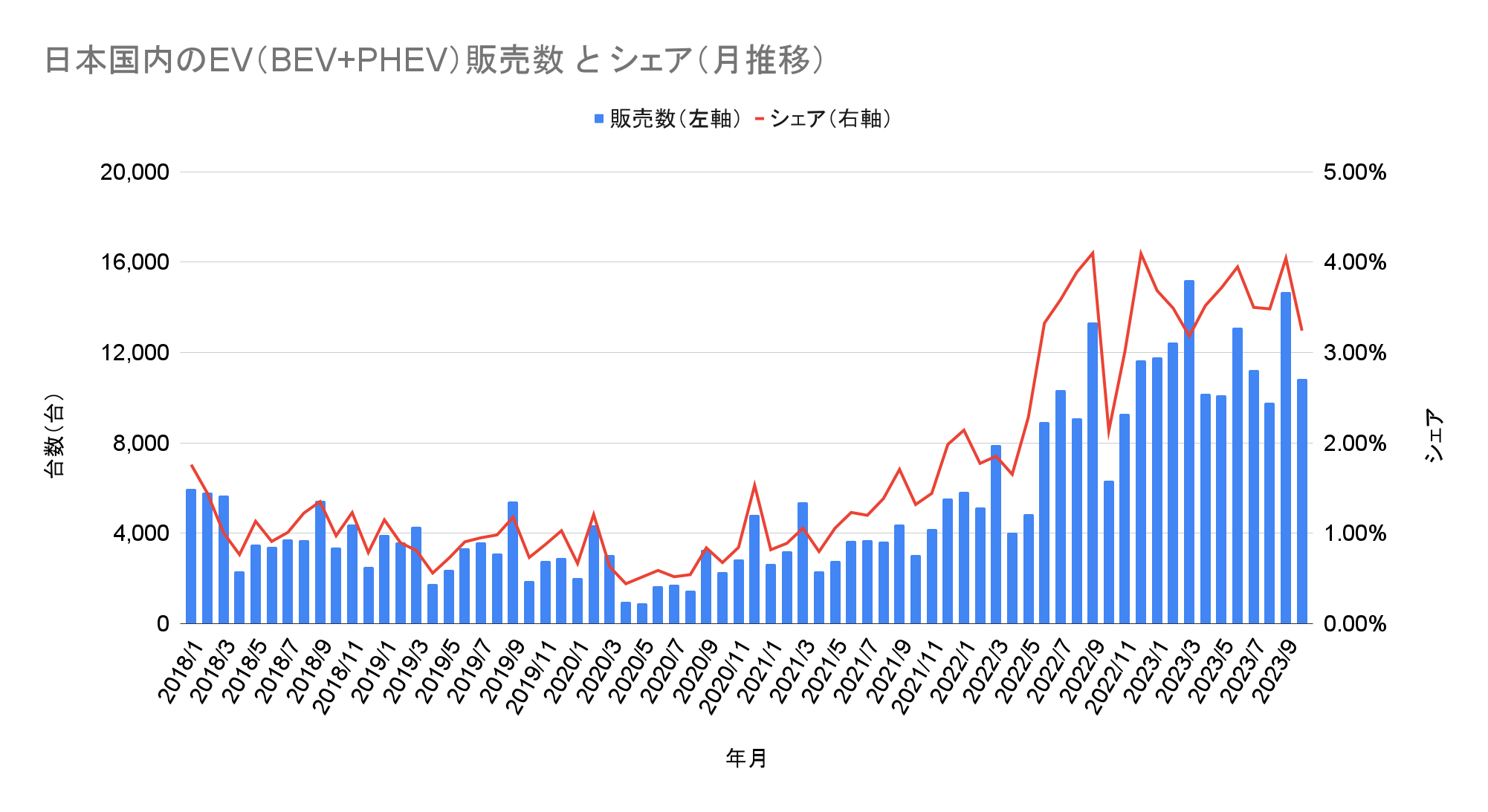 【日本国内のEV販売】2023年10月のEVシェアは3.2%、台数・シェアともに前年10月から増加!
