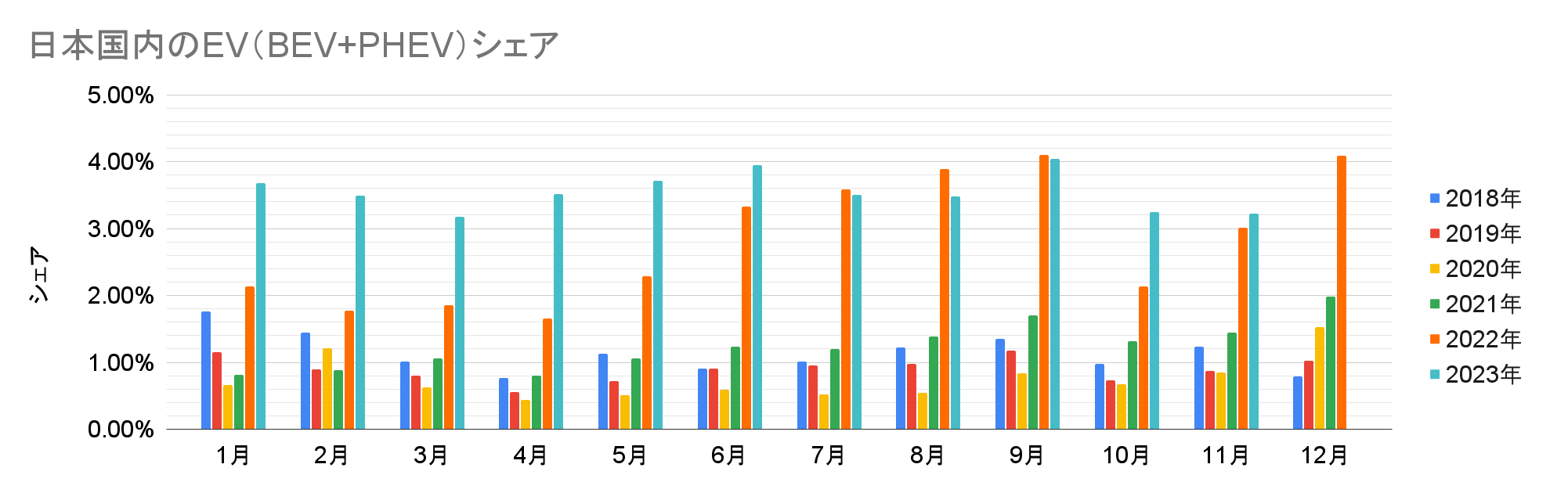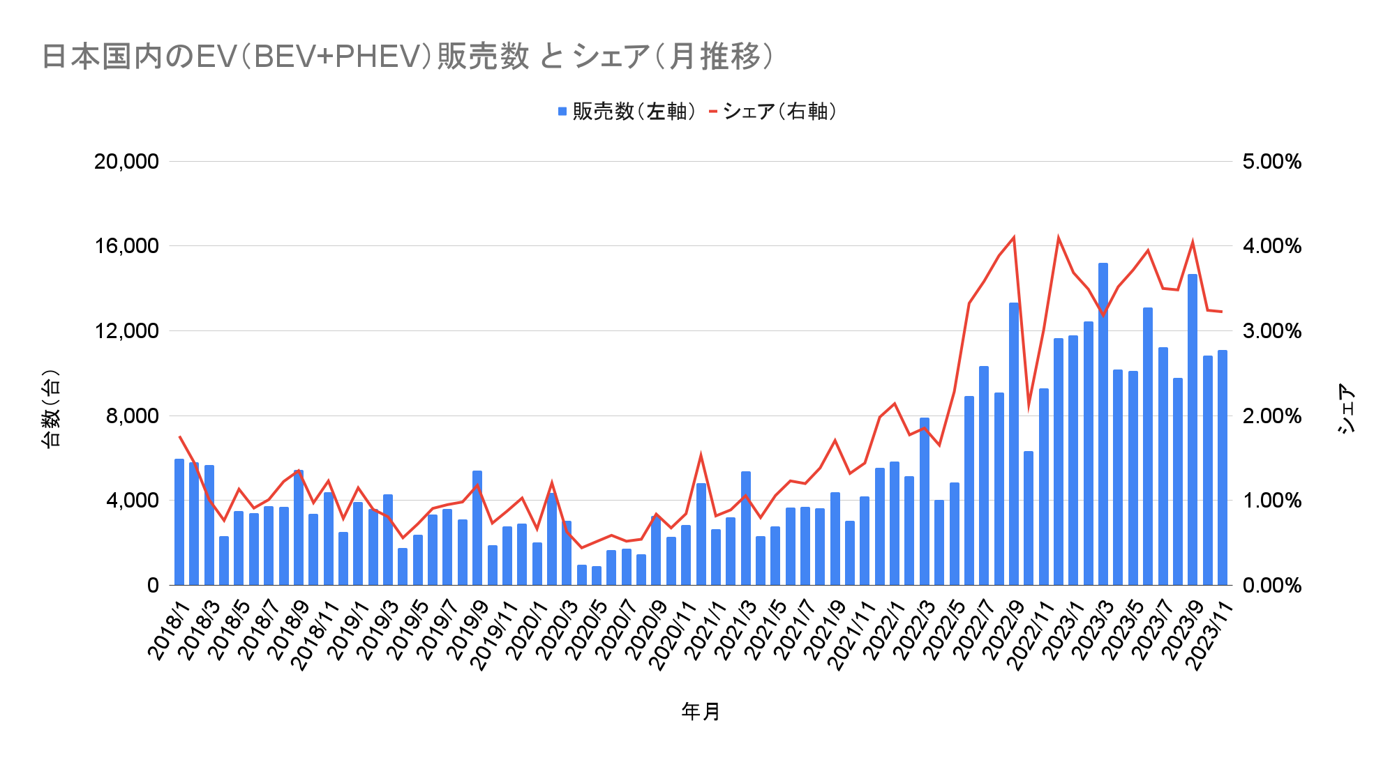 日本国内のEV(BEV+PHEV)販売数とシェアの推移(クリックで拡大)