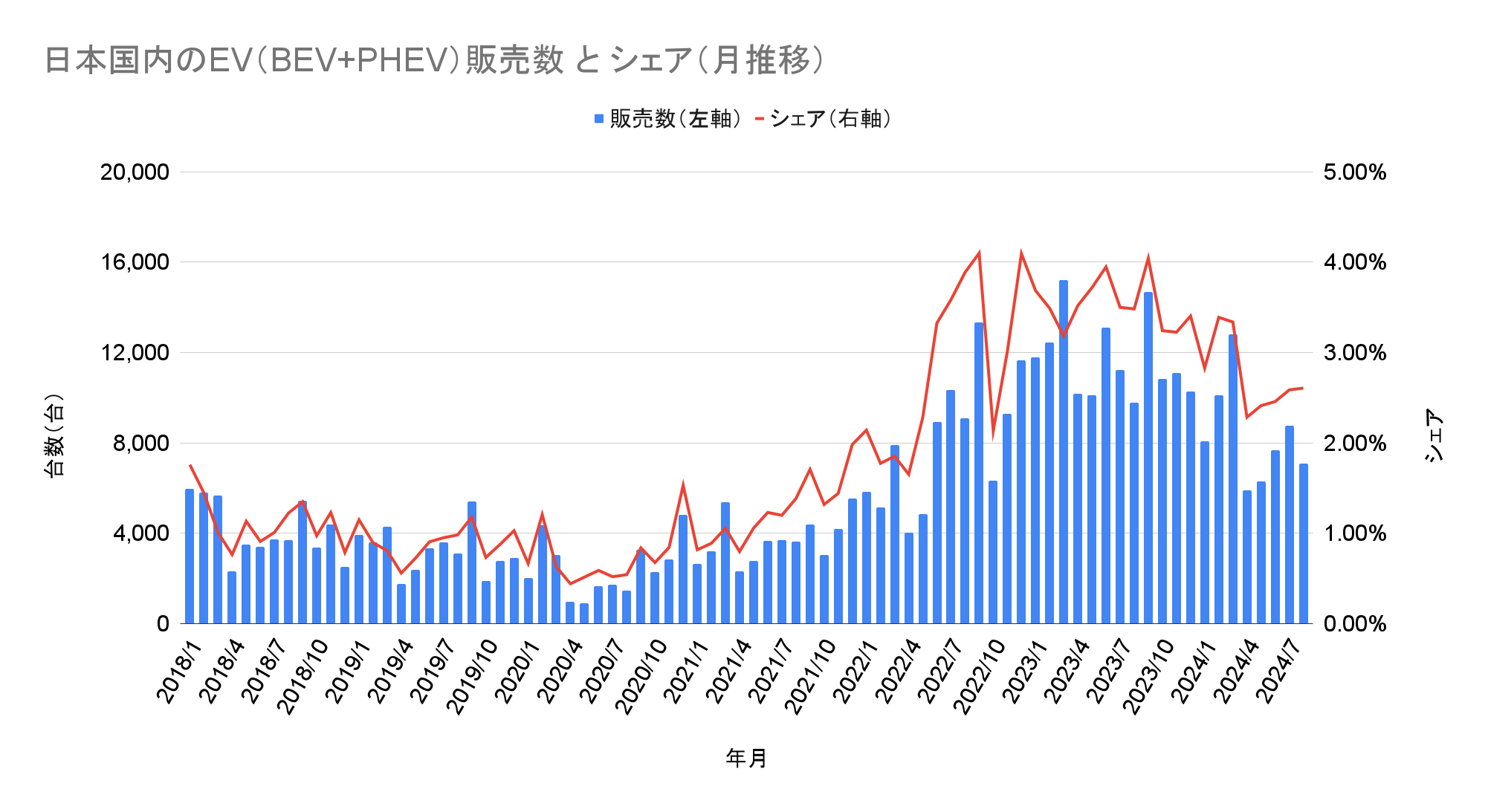 日本国内のEV(BEV+PHEV)販売数とシェアの推移(クリックで拡大)