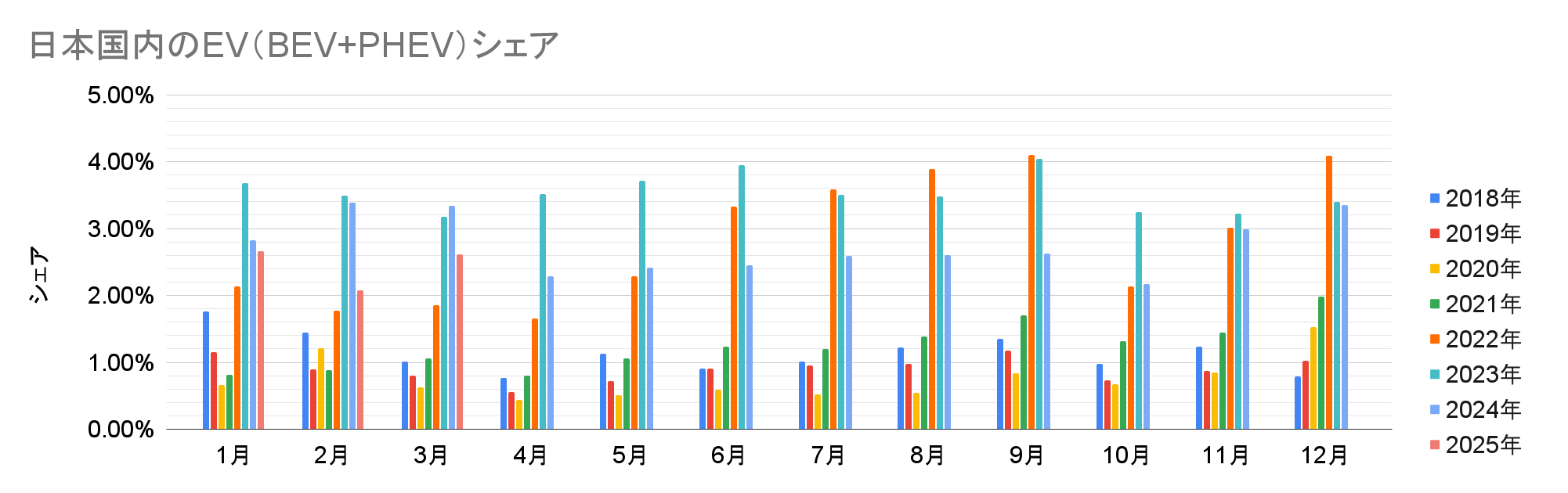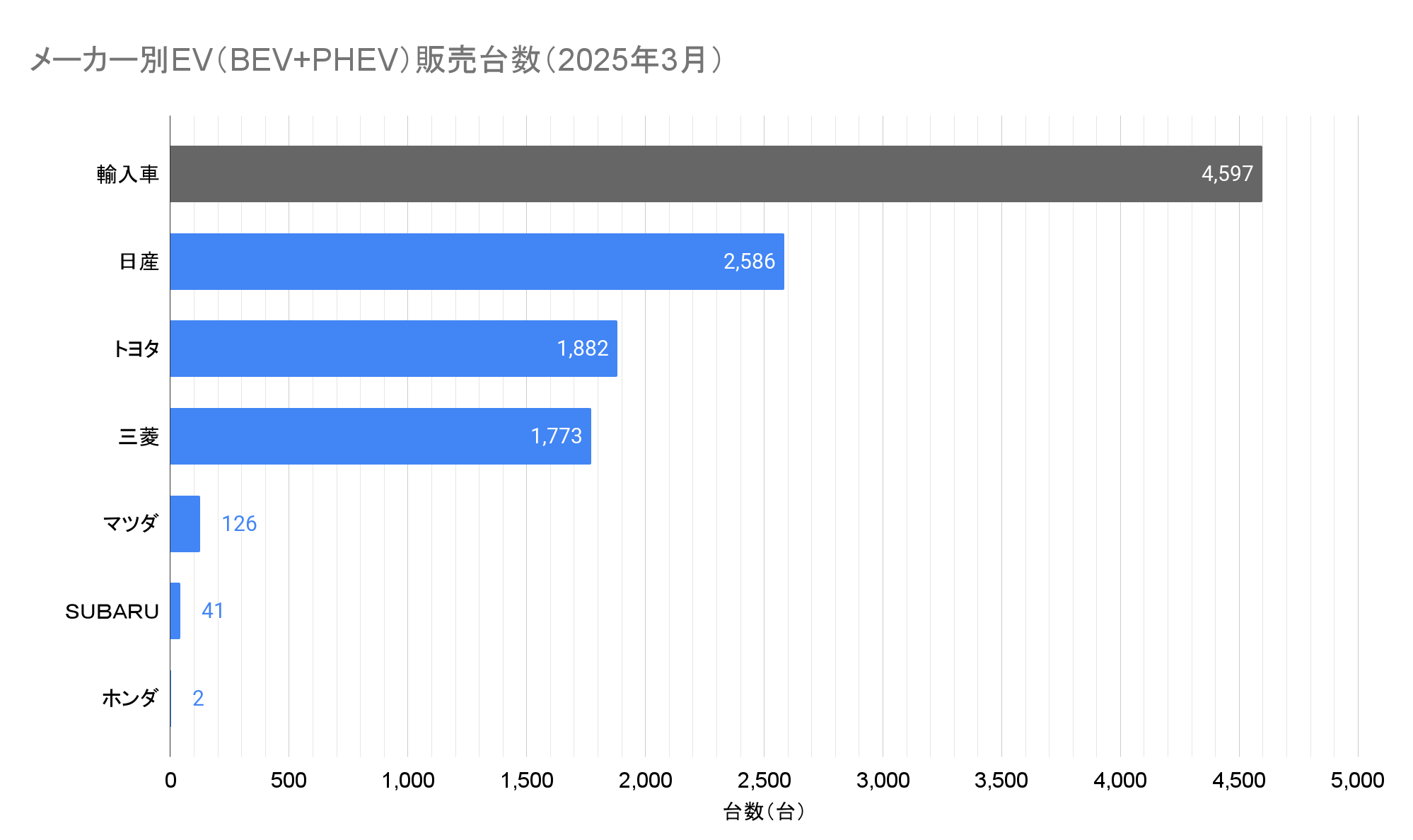 【日本国内のEV販売】2025年3月のEVシェアは2.6%、減少続くも輸入車は過去最多に