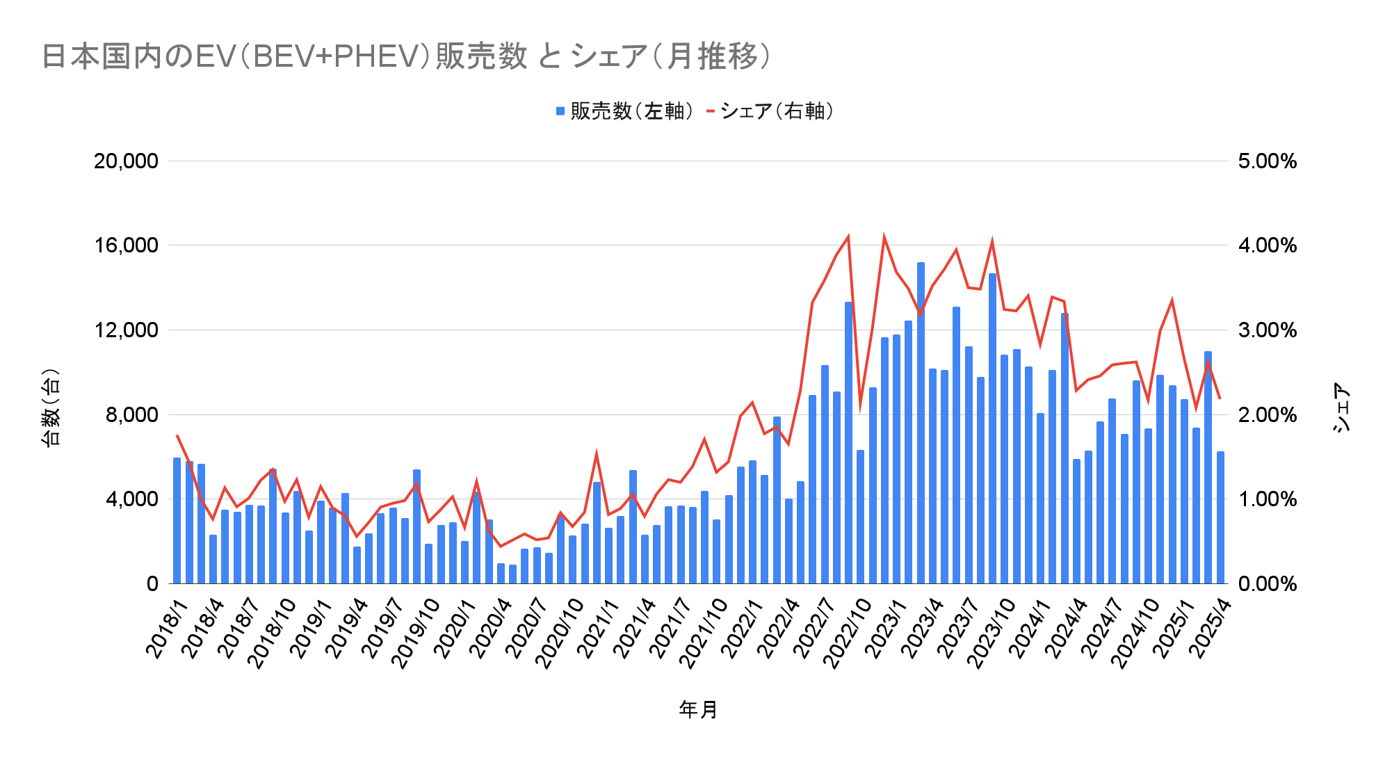 日本国内のEV(BEV+PHEV)販売数とシェアの推移(クリックで拡大)