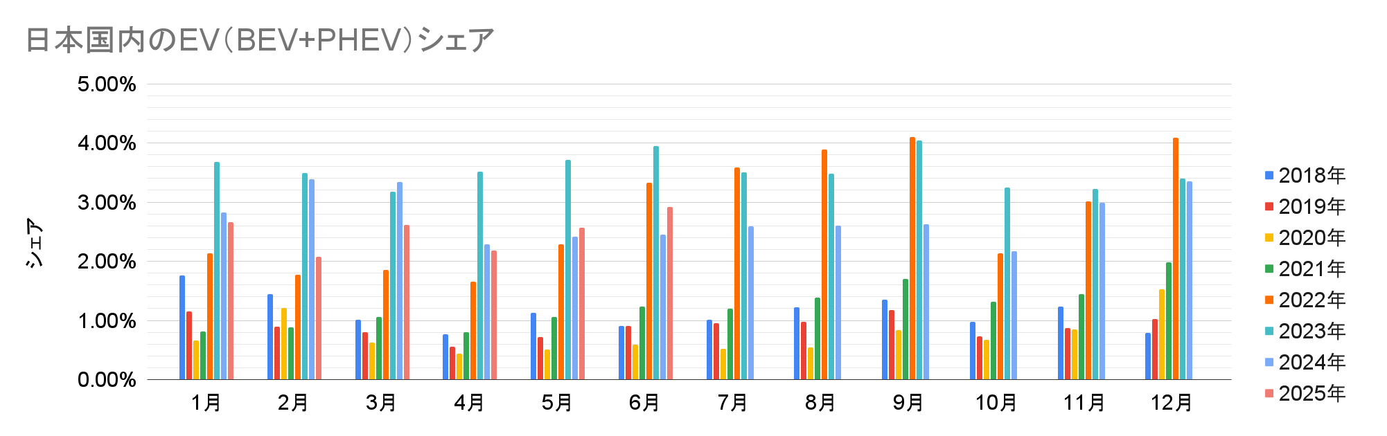 ・EV(プラグイン車合計):9,589台(乗用車全体の 2.91%、前年比 +25.18%)