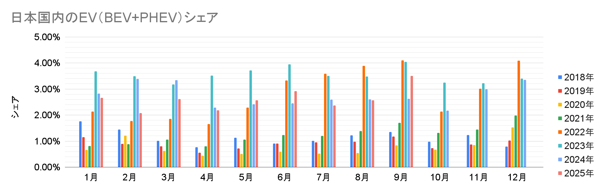 ・EV(プラグイン車合計):12,542台(乗用車全体の 3.51%、前年比 +30.71%)