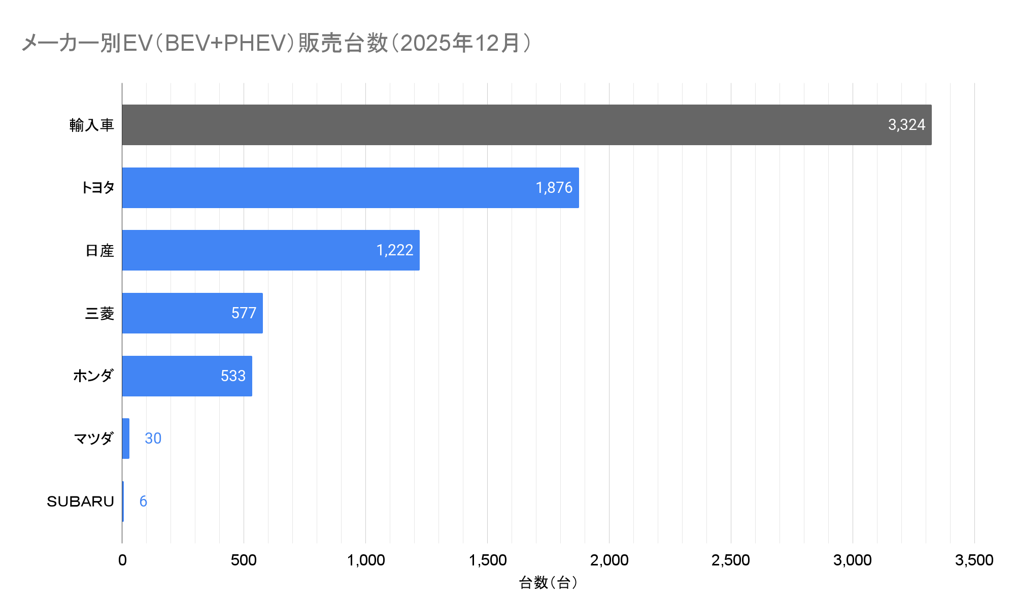 メーカー別の販売台数では、輸入車の合計が3,324台で最多となった。輸入車の合計が最多となった月は、2025年だけで10回に上った。国内メーカーの最多は1,876台を販売したトヨタで、bZ4Xが762台を販売し前月に続き車種別のTOP50にランクインした。国内メーカーの2位は1,222台を販売した日産、3位は577台を販売した三菱、ホンダは533台を販売し僅差で4位となった。